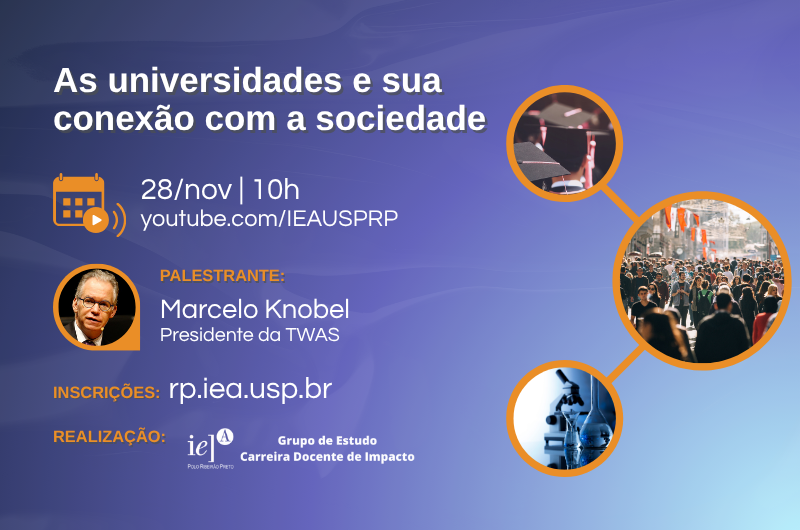 Mostrar à sociedade como a produção acadêmica e científica das universidades impacta no dia a dia é fundamental para que ela entenda a importância de valorizar essas instituições e, no caso das universidades públicas, cobrar dos governos investimento em sua manutenção. Pensando nisso, o Grupo de Estudo Carreira Docente de Impacto, do Instituto de Estudos Avançados Polo Ribeirão Preto da USP, promove no dia 28 de novembro, a partir das 10h, a conferência “As universidades e sua conexão com a sociedade”.