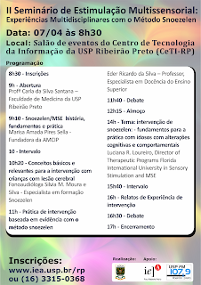 A primeira apresentação será de Marisa Sella (Associação Snoezelen/Paraná) que irá abordar a história, os fundamentos e a prática do método Snoezelen, em seguida, a fonoaudióloga Silvia Moura e Silva (APAE Bauru) irá explicar os conceitos básicos que envolvem a intervenção com crianças com lesão cerebral.