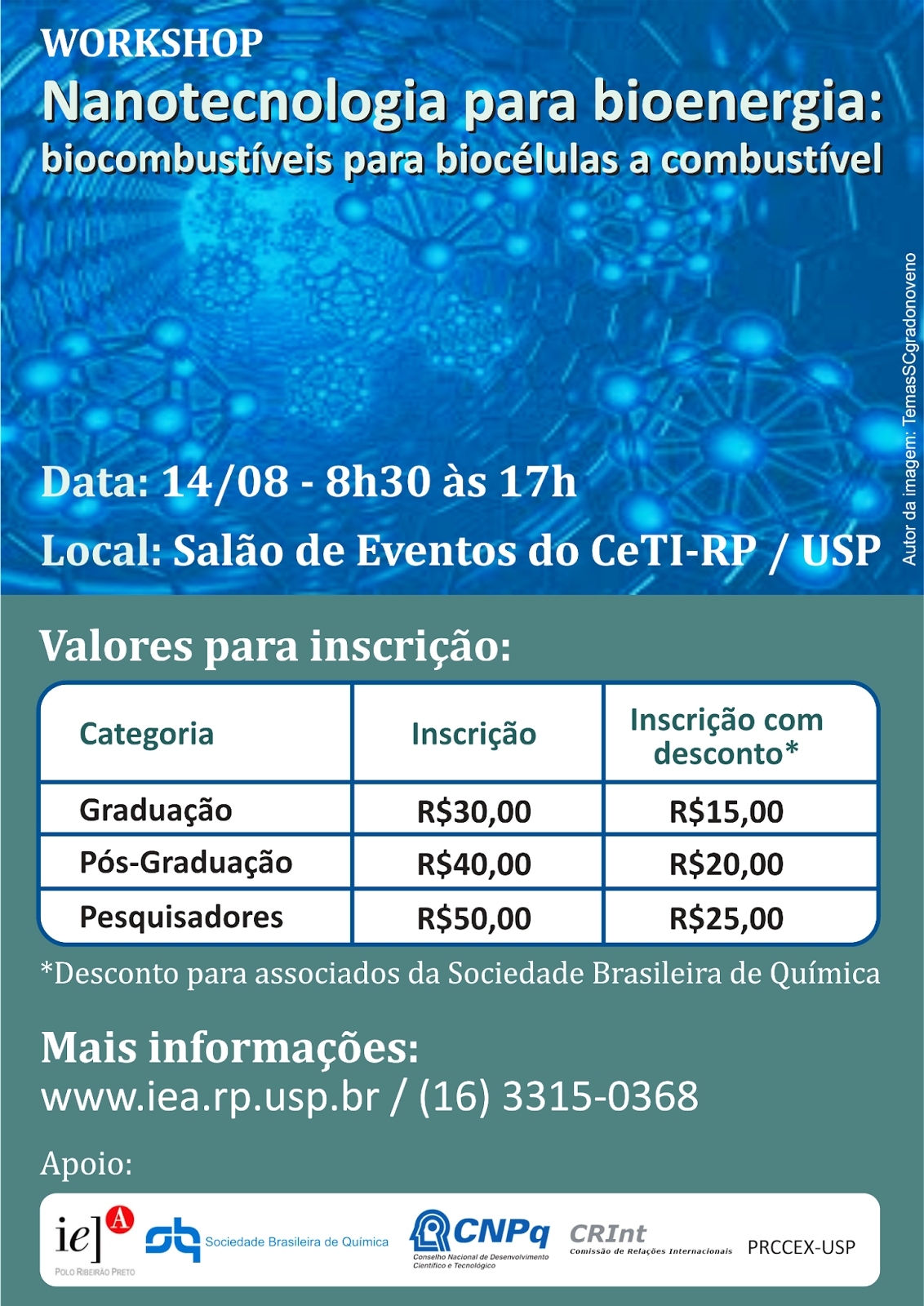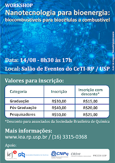No dia 14 de agosto, das 8h30 às 17h, ocorrerá o “Workshop Nanotecnologia para Bioenergia: biocombustíveis para biocélulas a combustível”. A atividade será em inglês e acontecerá no salão de eventos do Centro de Tecnologia da Informação da USP Ribeirão Preto (CeTI-RP/USP).
